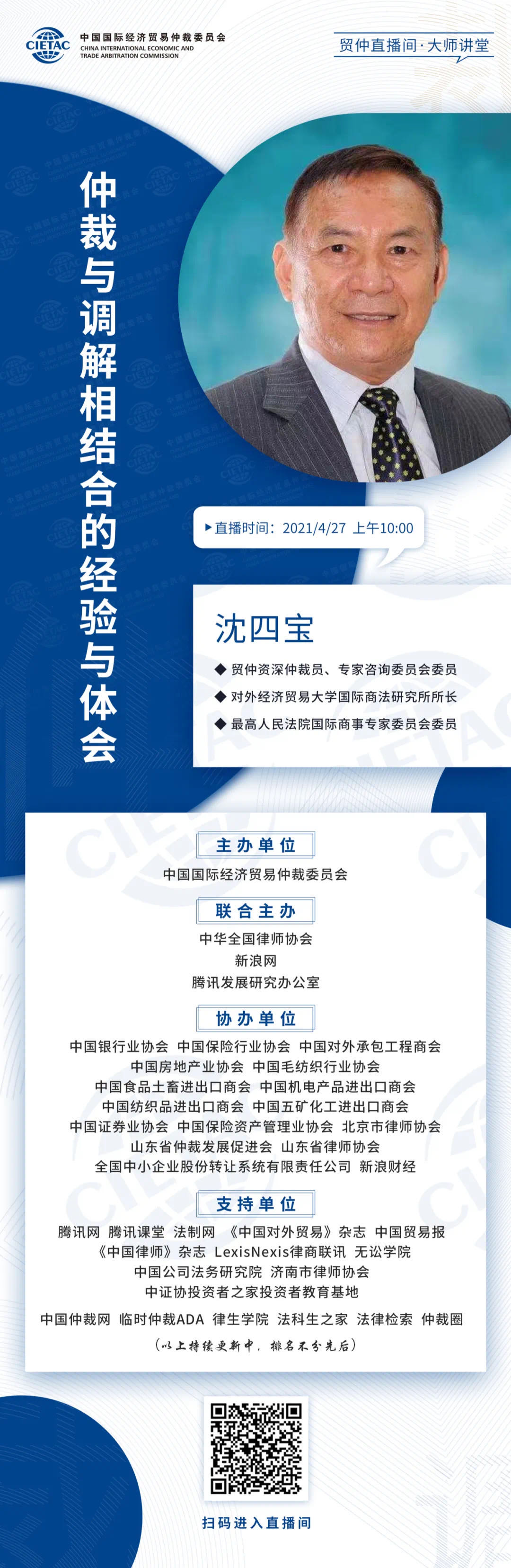 貿(mào)仲直播間-大師講堂系列課程第三講將于2021年4月27日(星期二)上午10時(shí)邀請(qǐng)貿(mào)仲資深仲裁員、專(zhuān)家咨詢(xún)委員會(huì)委員,對(duì)外經(jīng)濟(jì)貿(mào)易大學(xué)國(guó)際商法研究所所長(zhǎng),最高人民法院國(guó)際商事專(zhuān)家委員會(huì)委員沈四寶教授,講解“仲裁與調(diào)解相結(jié)合的經(jīng)驗(yàn)與體會(huì)”。
