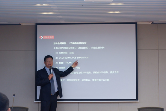 張振安律師以 “涉外經(jīng)貿(mào)合同法律風(fēng)險(xiǎn)和爭議解決”為題進(jìn)行了發(fā)言。他首先通過介紹一起真實(shí)案例,引出國際貨物貿(mào)易合同條款中當(dāng)事雙方可能忽略的問題。接著,梳理了國際貨物貿(mào)易合同的簽訂流程,對每一環(huán)節(jié)可能存在的風(fēng)險(xiǎn)點(diǎn)進(jìn)行了逐一講解,并結(jié)合我國民法典、國際貿(mào)易術(shù)語解釋通則(INCOTERMS)、聯(lián)合國國際貨物銷售合同公約(CISG)和跟單信用證統(tǒng)一慣例(UCP600),從國內(nèi)和國際兩個(gè)層面,對企業(yè)規(guī)避簽訂涉外貨物買賣合同過程中的風(fēng)險(xiǎn)給出了建議。最后,張律師通過對比仲裁與訴訟的區(qū)別,對仲裁作為爭議解決方式之一在國際貿(mào)易領(lǐng)域的優(yōu)勢進(jìn)行了詳細(xì)說明,并向現(xiàn)場參會者推薦了貿(mào)仲江蘇中心的示范仲裁條款。