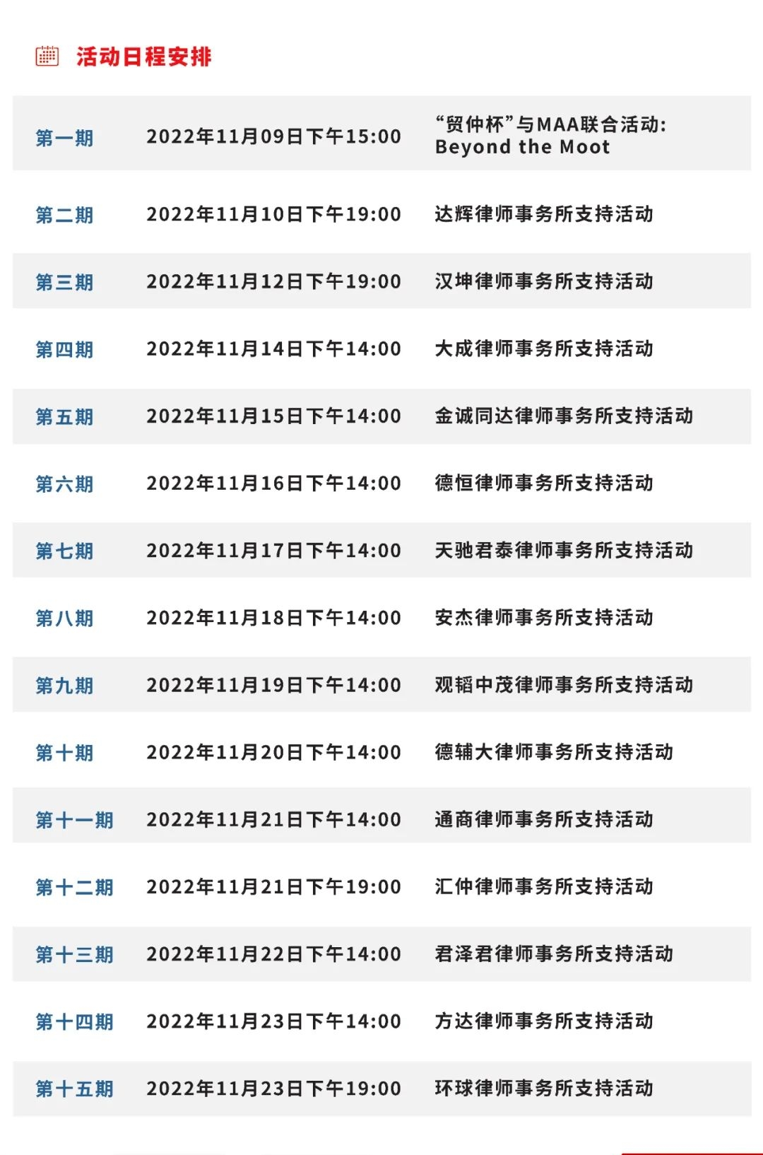 第二十屆“貿(mào)仲杯”國際商事仲裁模擬仲裁庭辯論賽Voice of Moot 系列培訓(xùn)活動(dòng)將于2022年11月9日開始,至11月23日結(jié)束,共計(jì)15期相關(guān)活動(dòng)?!百Q(mào)仲杯”辯論賽自2000年舉辦至今已歷經(jīng)十九屆,辯論賽始終秉持培養(yǎng)具備國際化實(shí)務(wù)能力的涉外仲裁法治人才的初心,匯集了大批國際仲裁法律人才。