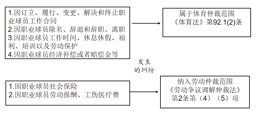 因職業(yè)球員工作合同履行而引發(fā)的糾紛,分別劃分為與勞動有關(guān)糾紛(含勞動關(guān)系確認、勞動報酬、社會保險、工傷醫(yī)療費糾紛)、與球員身份相關(guān)糾紛以及與球員商業(yè)權(quán)益有關(guān)糾紛,分別納入到勞動仲裁、體育仲裁和商事仲裁(人民法院)的受案范圍,充分利用好現(xiàn)有的糾紛解決機制,推動內(nèi)外結(jié)合的多元化體育解紛機制不斷完善。
