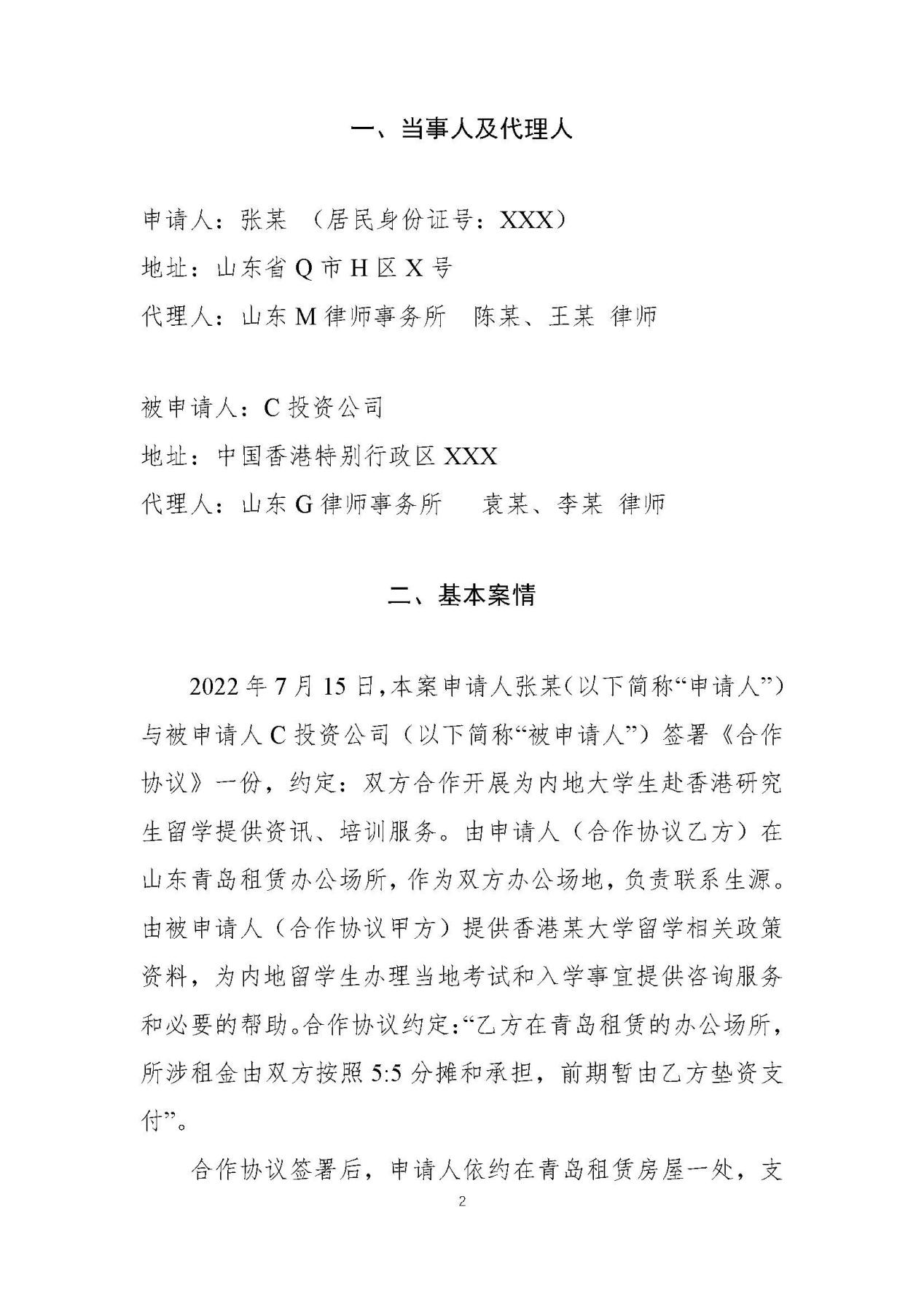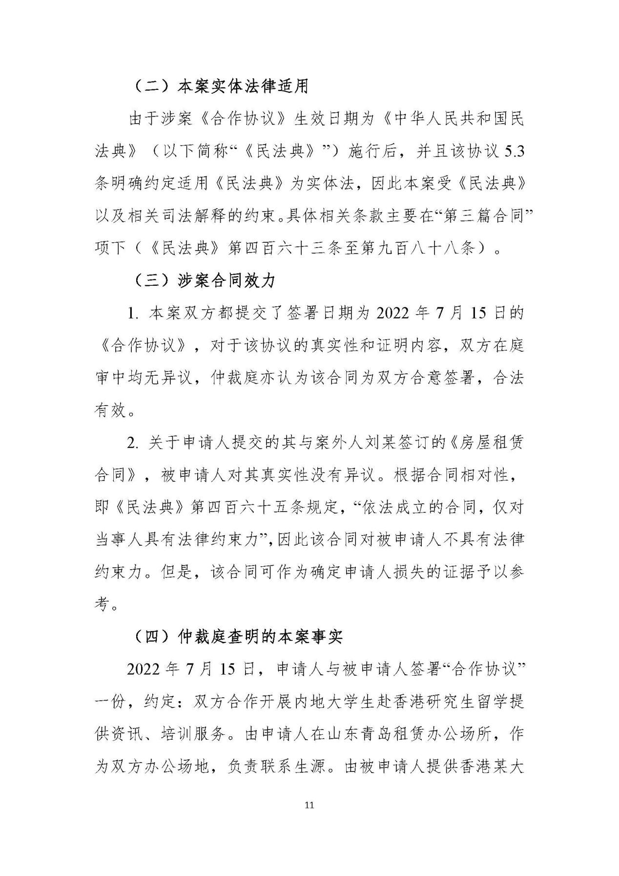 案件涉及一起跨境合作協(xié)議糾紛,申請人為中國內地居民,被申請人為中國香港公司。雙方約定合作開展為內地大學生赴香港研究生留學提供資訊、培訓服務。雙方因合作協(xié)議的履行產生爭議。本案合作協(xié)議“爭議解決”條款明確約定:“因本協(xié)議引起或與本協(xié)議有關的一切爭議,雙方同意以仲裁方式解決,適用《中國海商法協(xié)會臨時仲裁規(guī)則》。”“仲裁庭由一名仲裁員組成,仲裁語言為中文,仲裁協(xié)議準據法為香港仲裁法,開庭地點山東青島?!薄氨緟f(xié)議適用《中華人民共和國民法典》為實體法,指定機構為中國海事仲裁委員會或中國海事仲裁委員會青島仲裁中心?!薄爸俨貌脹Q為終局性裁決,雙方同意仲裁裁決在進行脫密處理后,可以由指定機構以適當方式公開?!?/p>