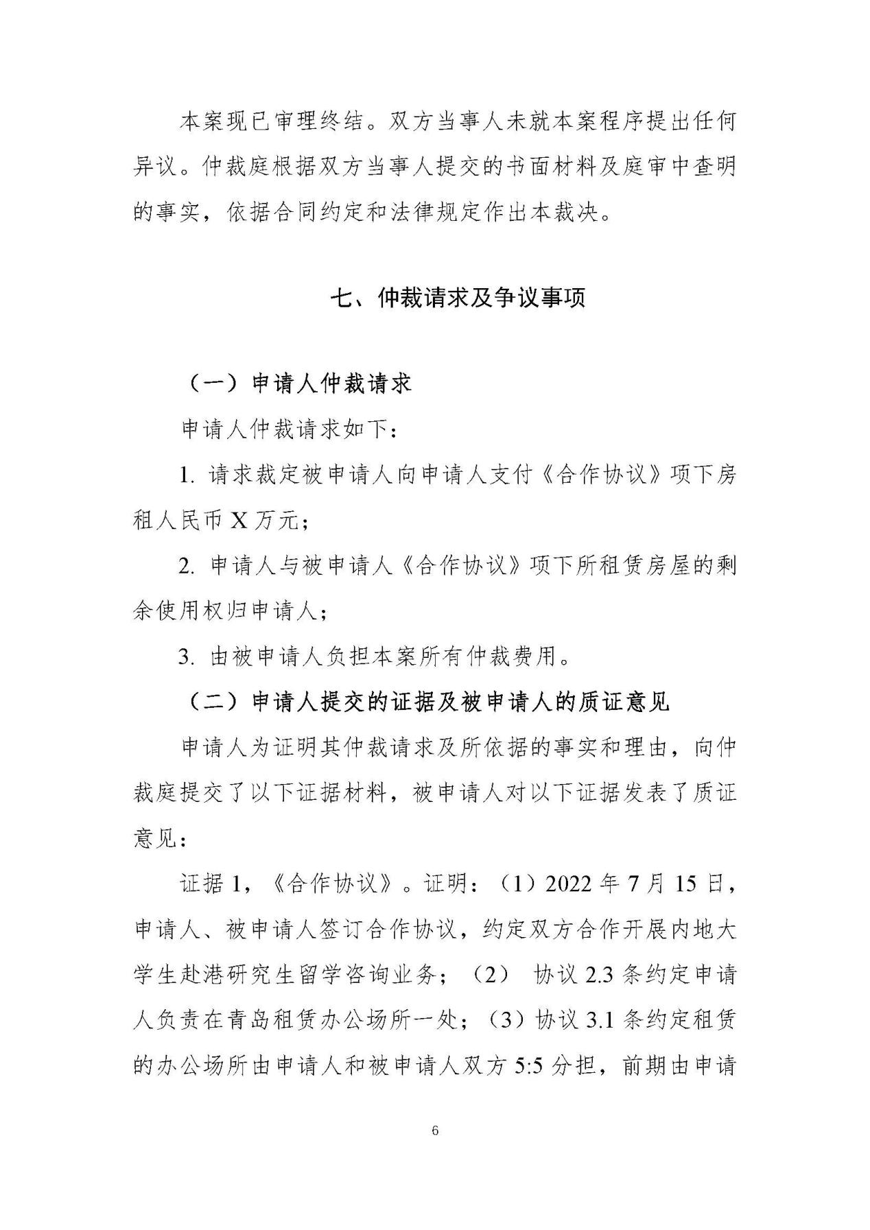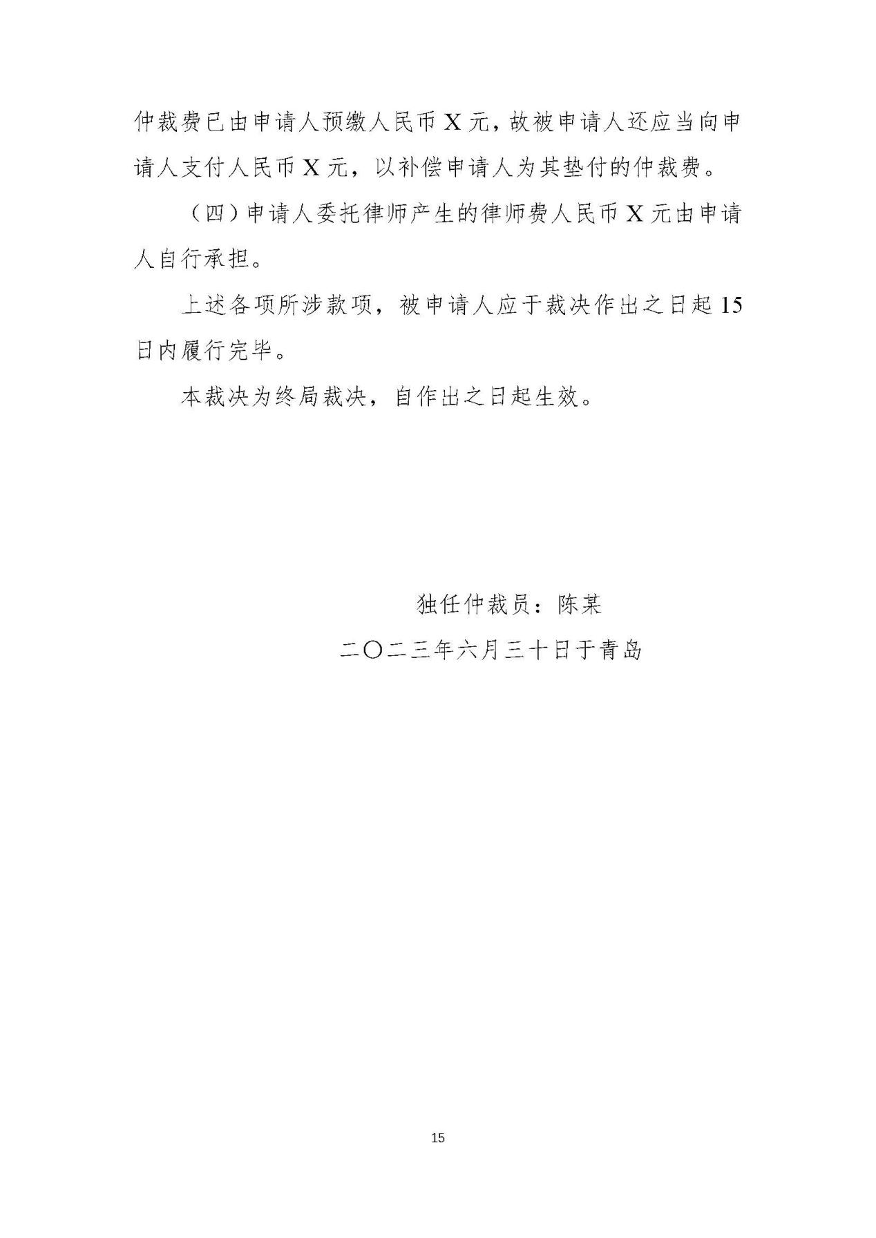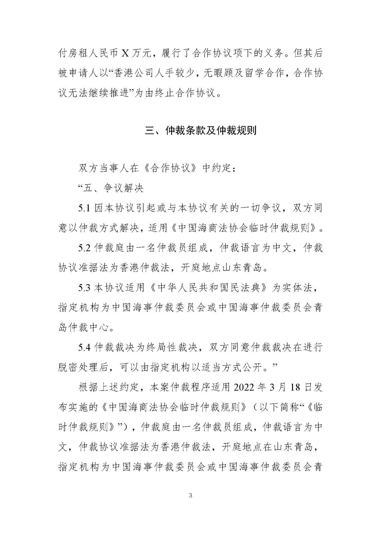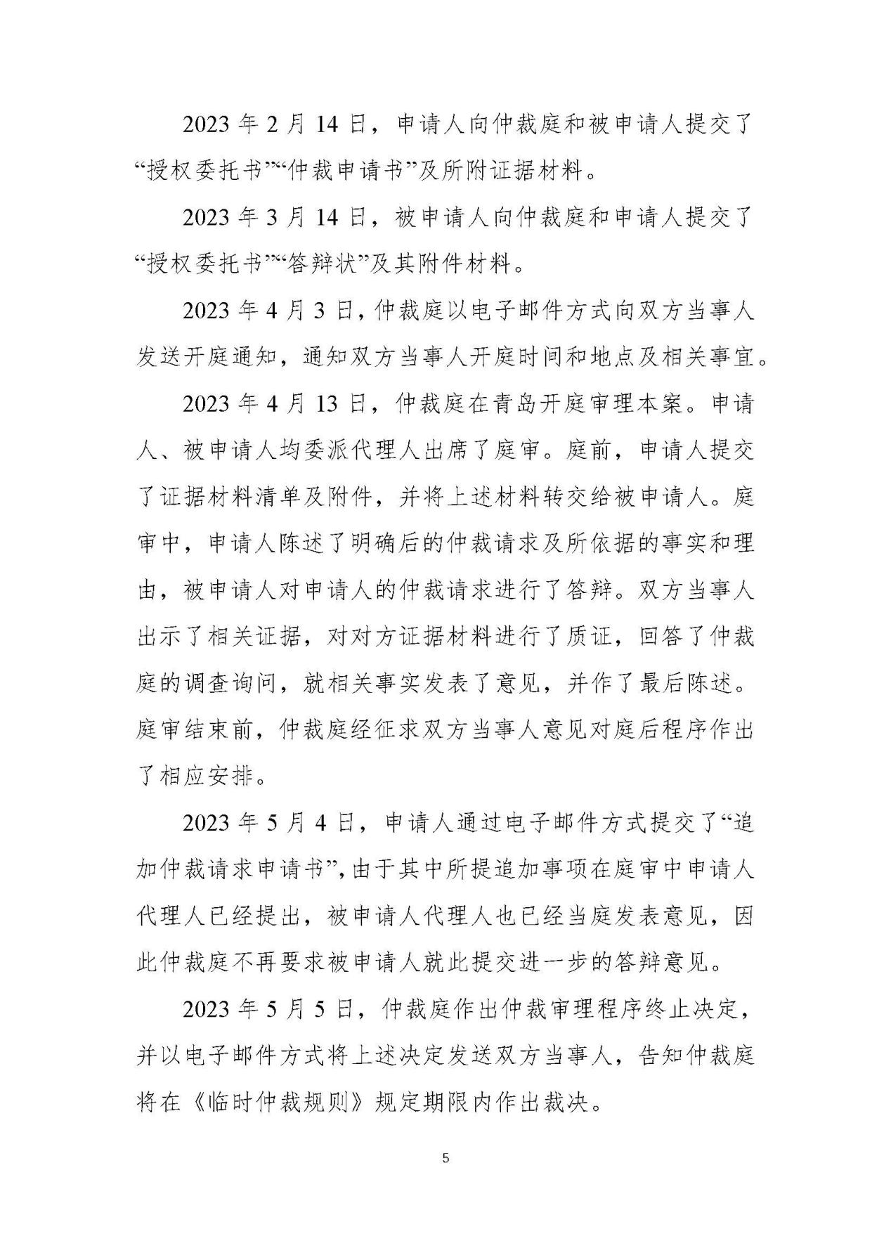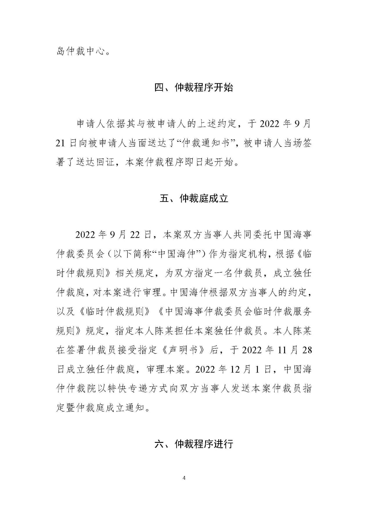 根據上述約定,申請人按照《海協(xié)臨時仲裁規(guī)則》規(guī)定,于2022年9月21日向被申請人發(fā)送“仲裁通知書”,被申請人簽署確認,仲裁程序自此開始。在仲裁程序中,由于雙方當事人未能就仲裁員的選定達成一致意見,雙方共同申請由中國海仲為本案指定一名仲裁員,成立仲裁庭,進行審理。根據雙方當事人約定及《海協(xié)臨時仲裁規(guī)則》《中國海仲臨時仲裁服務規(guī)則》規(guī)定,中國海仲為該案指定一名仲裁員,成立仲裁庭。此后案件程序全部由仲裁庭依據《海協(xié)臨時仲裁規(guī)則》主持進行。仲裁庭于2023年4月13日在中國海仲青島仲裁中心開庭審理本案,5月5日作出仲裁審理程序終止決定,6月30日作出仲裁裁決。