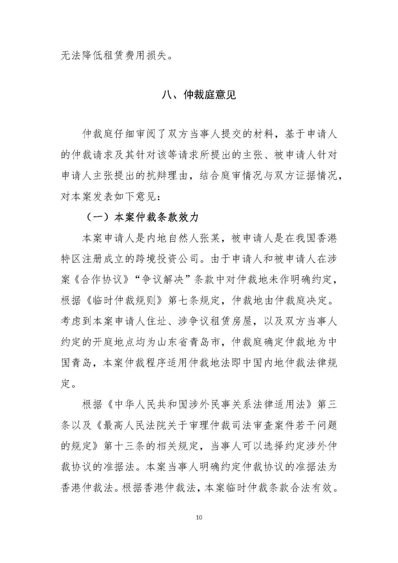 作為境內首起適用《海協(xié)臨時仲裁規(guī)則》的案件,其臨時仲裁條款的效力備受關注。仲裁庭專此在裁決書中予以論述。仲裁庭從案件涉港糾紛的性質出發(fā),依據雙方當事人未明確約定仲裁地的事實,根據《海協(xié)臨時仲裁規(guī)則》有關“仲裁地”的規(guī)定,考慮到申請人住址、涉爭議租賃房屋,以及雙方當事人約定的開庭地均位于山東省青島市,首先確定案件仲裁地為中國青島,明確案件仲裁程序適用仲裁地法即中國內地仲裁法律規(guī)定;繼而根據《中華人民共和國涉外民事關系法律適用法》以及《最高人民法院關于審理仲裁司法審查案件若干問題的規(guī)定》有關“當事人可以選擇約定涉外仲裁協(xié)議的準據法”的規(guī)定,依據雙方當事人明確約定仲裁協(xié)議的準據法為香港仲裁法的事實,認定本案臨時仲裁條款合法有效。