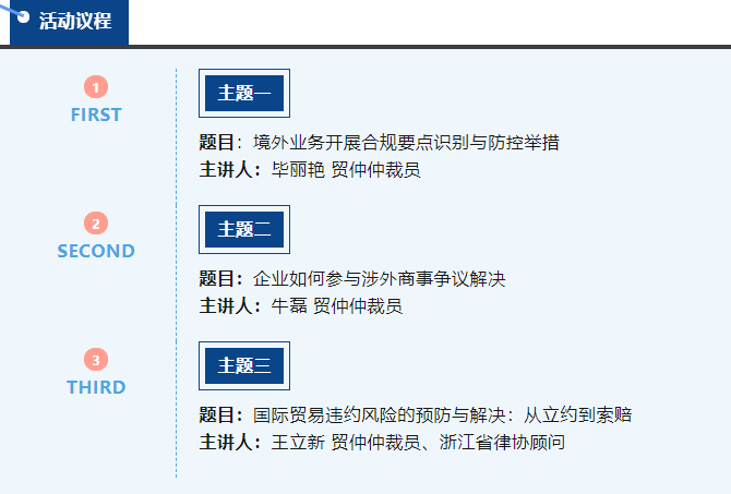 在全球化的商貿(mào)投資環(huán)境中,隨著我國經(jīng)濟(jì)主體“走出去”由量到質(zhì)的發(fā)展方向轉(zhuǎn)變,外向型企業(yè)面臨著日益復(fù)雜和多樣化的合規(guī)需求與法律風(fēng)險(xiǎn),包括跨境貿(mào)易、投資、管制合規(guī)、知識產(chǎn)權(quán)合規(guī)、國際法與外國法合規(guī)、違約風(fēng)險(xiǎn)管理等。為幫助企業(yè)加強(qiáng)法律風(fēng)險(xiǎn)理解與識別、提高合規(guī)與法律風(fēng)險(xiǎn)管理能力,擬在浙江省湖州市舉辦“外向型企業(yè)合規(guī)與法律風(fēng)險(xiǎn)管理”研討會。