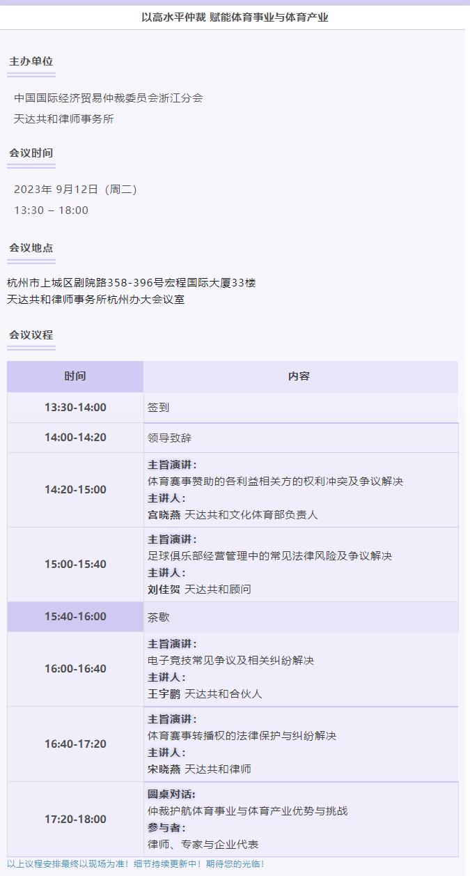 今年6月24日,新修訂的《中華人民共和國體育法》頒布一周年。一年來,我國體育仲裁與體育商事仲裁事業(yè)雙雙迎來快速發(fā)展。值此杭州亞運(yùn)會(huì)盛大召開之際,現(xiàn)擬在第十一屆中國仲裁周期間舉辦專場(chǎng)論壇,深度探討如何以高水平仲裁,賦能體育事業(yè)與體育產(chǎn)業(yè),探索體育糾紛及體育相關(guān)商事糾紛解決路徑,為我國的體育事業(yè)和產(chǎn)業(yè)發(fā)展提供法律視角、貢獻(xiàn)專業(yè)智慧。