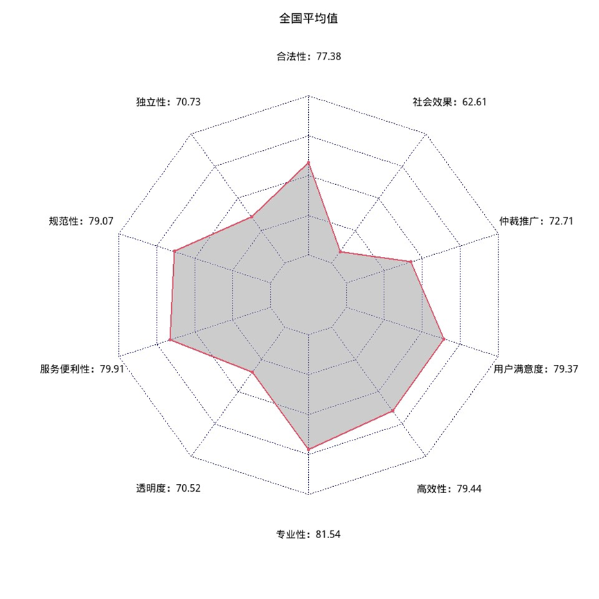 二級指標(biāo)反映的是仲裁價(jià)值的實(shí)現(xiàn)程度。從二級指標(biāo)得分情況來看,得分較高的是服務(wù)便利性、高效性和本地用戶滿意度。得分較低的是社會(huì)效果和透明度。社會(huì)效果指標(biāo)由兩個(gè)比例構(gòu)成,一是受案標(biāo)的額與仲裁機(jī)構(gòu)所在地國內(nèi)生產(chǎn)總值的比例,二是仲裁機(jī)構(gòu)受理案件數(shù)量與當(dāng)?shù)刂屑壢嗣穹ㄔ菏芾砻裆淌掳讣谋壤?。仲裁機(jī)構(gòu)所在地中級人民法院的受案數(shù)量不完整的,以全國仲裁案件占全國民商事訴訟案件的比例為缺失值計(jì)算。仲裁受理民商事案件占訴訟案件比例較低,表明仲裁在促進(jìn)市場經(jīng)濟(jì)建設(shè)、優(yōu)化營商環(huán)境以及完善社會(huì)治理體系方面還具有較大的潛力。