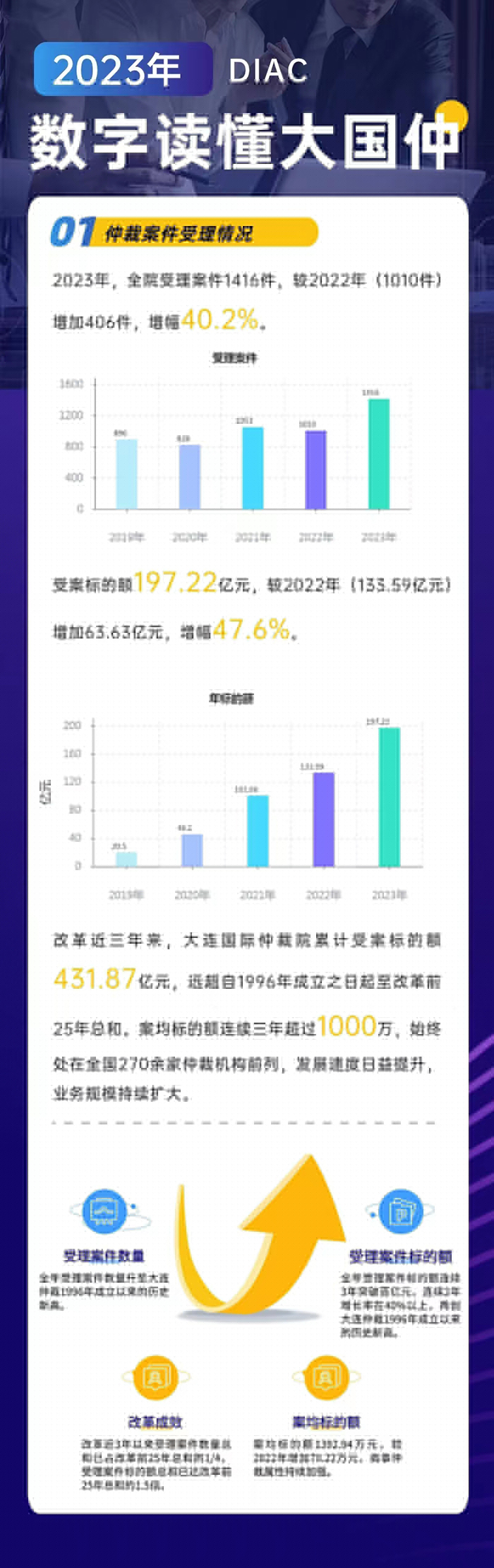 2023年,是大連國際仲裁院(大連仲裁委員會)順利完成體制機(jī)制改革的第三個年頭。大連國際仲裁院堅(jiān)定不移在法治軌道上推進(jìn)大連仲裁發(fā)展體系和能力現(xiàn)代化。全年仲裁業(yè)務(wù)實(shí)現(xiàn)跨越式發(fā)展,辦案質(zhì)效全面提升,公共法律服務(wù)平臺的輻射面持續(xù)擴(kuò)大,機(jī)構(gòu)品牌的影響力和公信力不斷增強(qiáng)。在推進(jìn)東北亞國際仲裁中心建設(shè),營造優(yōu)質(zhì)的法治化營商環(huán)境,擦亮“大連仲裁”的金字招牌上邁出堅(jiān)實(shí)步伐。