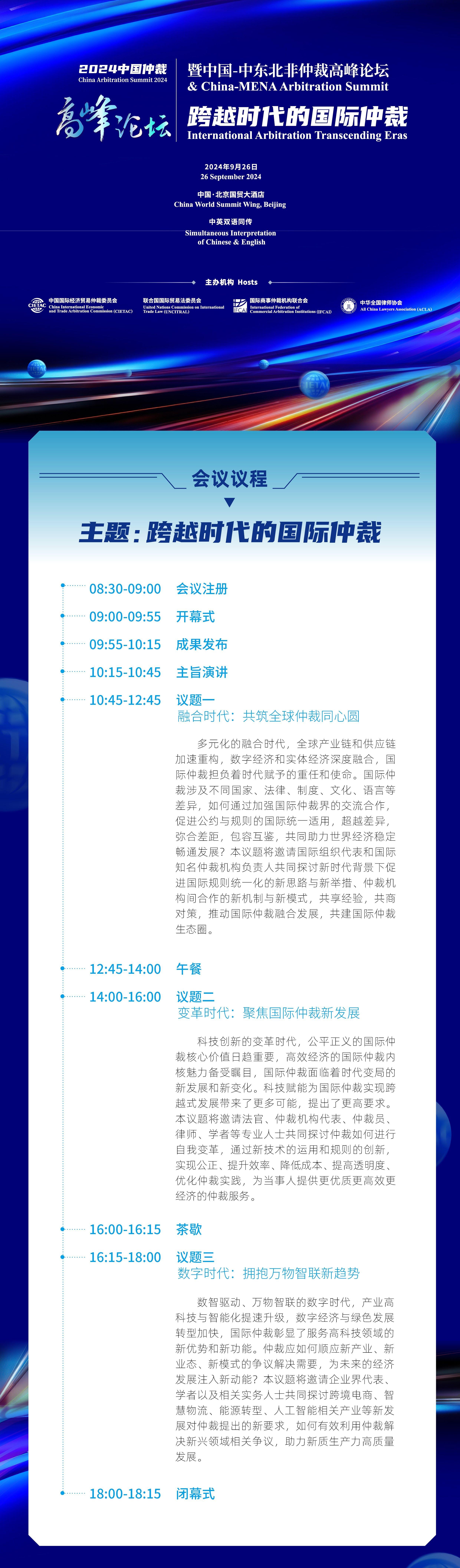 由中國國際經(jīng)濟貿(mào)易仲裁委員會(CIETAC)、聯(lián)合國國際貿(mào)易法委員會(UNCITRAL)、國際商事仲裁機構(gòu)聯(lián)合會(IFCAI)以及中華全國律師協(xié)會(ACLA)聯(lián)合舉辦的2024中國仲裁高峰論壇暨中國-中東北非仲裁高峰論壇將于2024年9月26日在北京舉辦。