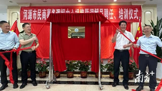 河源市司法局黨組書記、局長李慶鐸,河源市民政局黨組成員、二級調研員李琦,河源市民商事務調解中心理事長、河源仲裁委員會主任藍鋒,河源市民商事務調解中心秘書長吳松為調解中心揭牌。