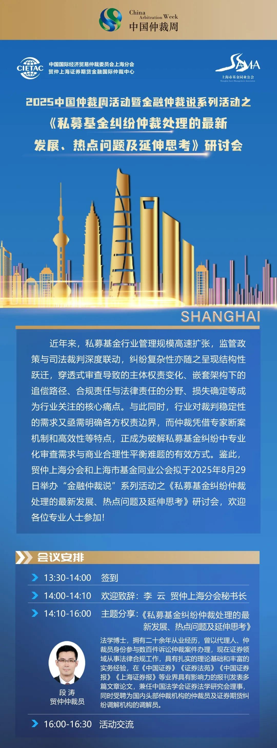 由中國(guó)國(guó)際經(jīng)濟(jì)貿(mào)易仲裁委員會(huì)等單位聯(lián)合發(fā)起的2025年第十三屆中國(guó)仲裁周即將拉開帷幕。為進(jìn)一步提升中國(guó)仲裁周活動(dòng)平臺(tái)專業(yè)價(jià)值與全球影響力,貿(mào)仲上海分會(huì)和上海市基金同業(yè)公會(huì)將于2025年8月29日舉辦2025中國(guó)仲裁周活動(dòng)暨金融仲裁說(shuō)系列活動(dòng)之《私募基金糾紛仲裁處理的最新發(fā)展、熱點(diǎn)問(wèn)題及延伸思考》研討會(huì),期待各位嘉賓報(bào)名參與。