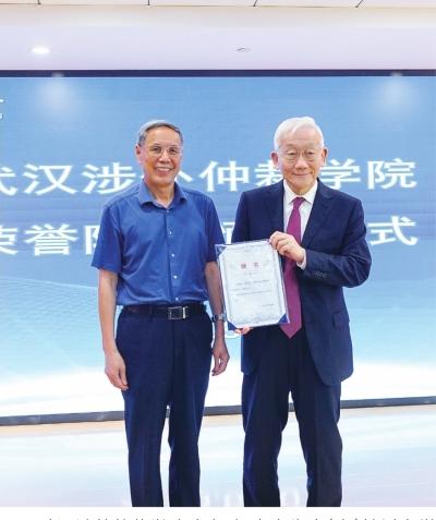 武漢涉外仲裁學(xué)院成立,楊良宜先生(右)接過名譽(yù)院長聘書。