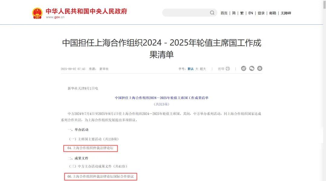 9月1日,上海合作組織成員國元首理事會(huì)第二十五次會(huì)議在天津順利召開。外交部發(fā)布《中國擔(dān)任上海合作組織2024-2025年輪值主席國工作成果清單》(以下簡稱《成果清單》),中國國際經(jīng)濟(jì)貿(mào)易仲裁委員會(huì)(以下簡稱貿(mào)仲)兩項(xiàng)成果收錄其中。由貿(mào)仲主辦的“上合組織仲裁法律論壇”,被列入《成果清單》“主席國主要活動(dòng)”(第64項(xiàng))。論壇所發(fā)布的《上合組織仲裁法律論壇國際合作倡議》被列入《成果清單》“中方主辦活動(dòng)成果文件”(第66項(xiàng))。