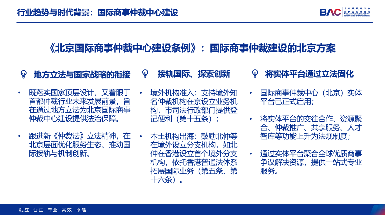 《條例》于2025年9月26日經(jīng)北京市十六屆人大常委會第十九次會議表決通過,提出了國際商事仲裁中心建設(shè)的總體要求,包括優(yōu)化仲裁發(fā)展環(huán)境,支持仲裁改革創(chuàng)新,建設(shè)仲裁制度接軌國際、資源優(yōu)質(zhì)集聚、機(jī)構(gòu)國際一流、服務(wù)專業(yè)高效、司法保障優(yōu)良的國際商事仲裁中心,旨在打造國際商事爭議解決和法律服務(wù)優(yōu)選地,提升涉外法治保障和服務(wù)水平,助力北京營造市場化、法治化、國際化一流營商環(huán)境。