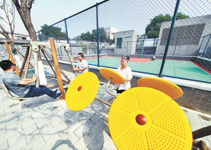 走出平安里地鐵站,原本空曠的街邊廣場座椅與健身器材錯落有致,街道空間真正變成了居民的“城市客廳”。 本報記者 方非攝