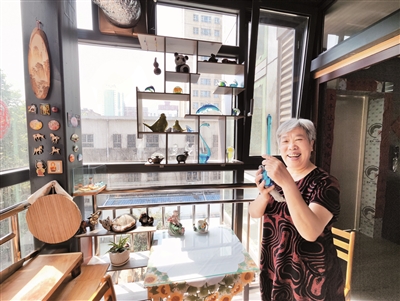 在加裝電梯后增加的“陽(yáng)光房”內(nèi),居民笑逐顏開(kāi)
