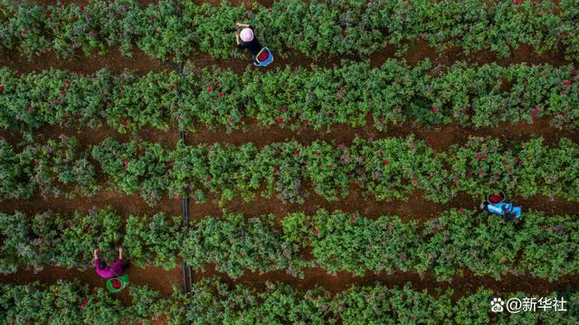 2021年9月9日,小河邊村小組村民在采摘鮮食玫瑰(無人機(jī)照片)。新華社記者 胡超攝