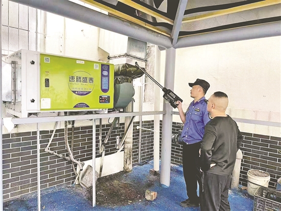 執(zhí)法人員檢查油煙凈化設(shè)備使用情況。