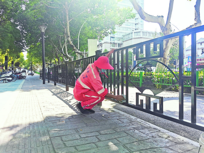 蕪湖路上,環(huán)衛(wèi)工人正在擦拭護欄。