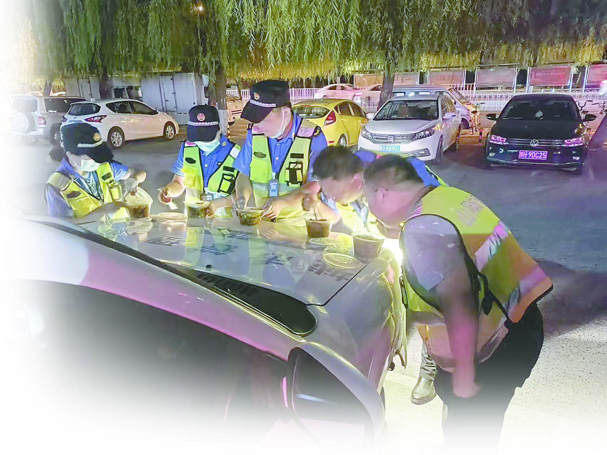 圖③ 山陽區(qū)城管局執(zhí)法一大隊三中隊孫玉新(中)吃著加班餐,疲憊的臉上依然擋不住對工作的熱愛。