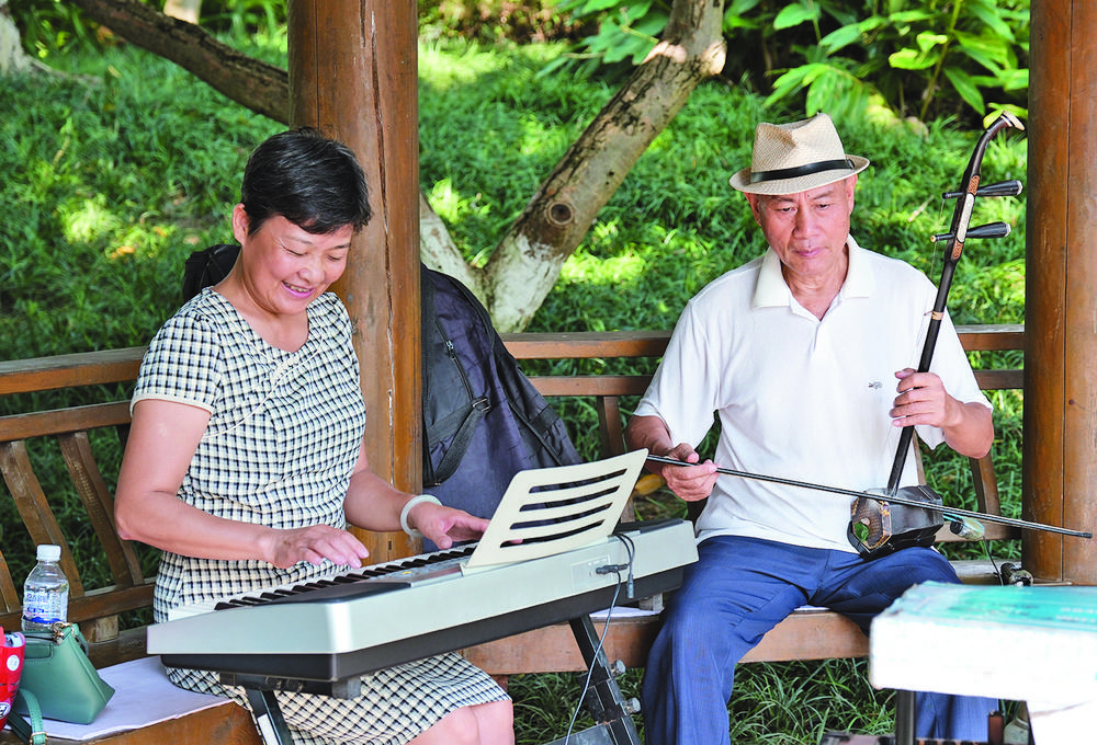 ⑤市民在江濱公園的涼亭里演奏樂(lè)器。