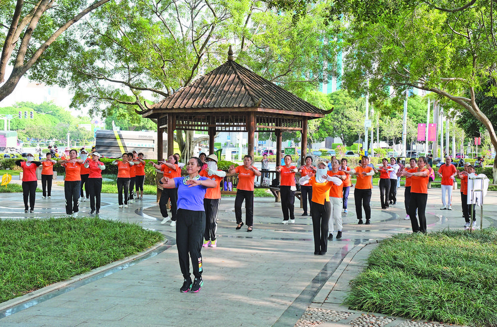 ②銅鼓公園內(nèi)的小廣場(chǎng)成了市民鍛煉身體的好地方。