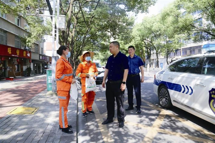 宜都市城市管理執(zhí)法局黨組書(shū)記、局長(zhǎng)黃志華(右二)為環(huán)衛(wèi)工人“送清涼”