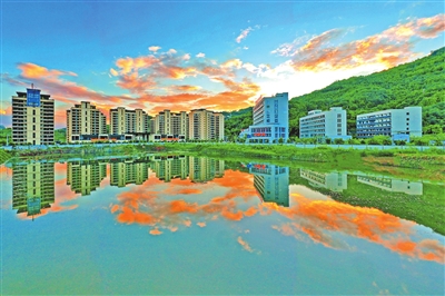 城市西區(qū)一角,晚霞與城市建筑倒映水面,頗有詩(shī)意。 記者 王瀘州 攝