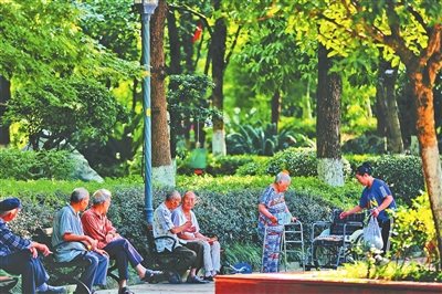 子如廣場(chǎng),市民坐在樹(shù)蔭下談笑風(fēng)生。 記者 王瀘州 攝
