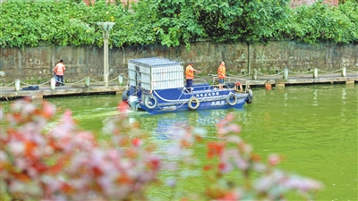 孝子河城區(qū)段,清漂工人在河面上清漂,保護(hù)“母親河”。 記者 王瀘州 攝
