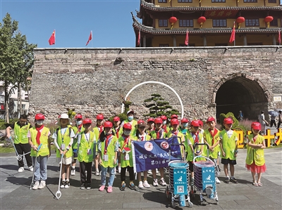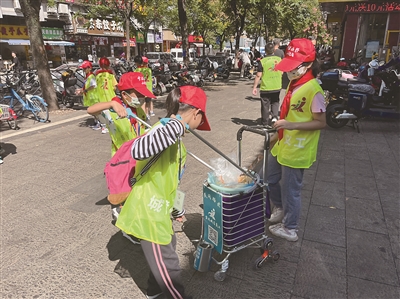 10月2日,氣溫已經(jīng)突破30℃,一群身穿“城管義工”綠馬甲的寧波晚報(bào)(現(xiàn)代金報(bào))小記者出現(xiàn)在鼓樓街道,他們熟練地?fù)炖?、撿煙蒂、扶單車?/p>