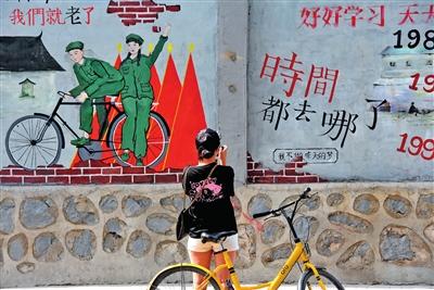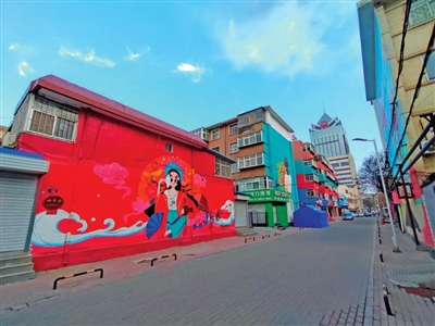 除了火紅的色彩外,巷子兩側(cè)老居民樓的外墻上,還繪了藍(lán)色的熊貓、橘紅的鹿、黃色的長頸鹿和航天科幻作品,以及上世紀(jì)七八十年代的理發(fā)店、小賣部。整條巷子看上去色彩斑斕。常住于此的市民韓巍東說,多年來,這條巷子給他的感覺是破舊、灰色的,但去年的這些改變,讓他日日走過的老巷,變得充滿活力和生機(jī),住在這里的人們,臉上也多了幾分笑意。