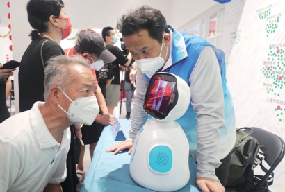 “醫(yī)加醫(yī)健康機(jī)器人”入駐普陀區(qū)部分居民區(qū),護(hù)衛(wèi)居民健康。該機(jī)器人”具有24小時在線診療、互聯(lián)網(wǎng)醫(yī)院門診預(yù)約、慢病配藥等為老服務(wù)功能。 攝影/張龍