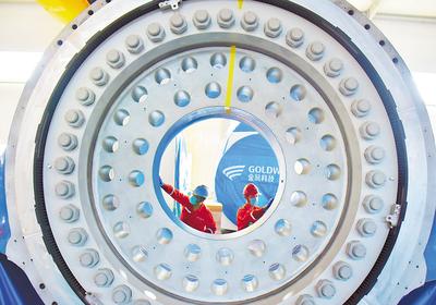 在七里河流經(jīng)的邢臺經(jīng)濟開發(fā)區(qū),金風(fēng)科技有限公司邢臺風(fēng)機總裝生產(chǎn)基地內(nèi),員工在檢查風(fēng)力發(fā)電機組軸系。