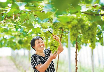 在七里河下游邢臺市南和區(qū)賈宋鎮(zhèn)一處蔬果大棚內(nèi),果農(nóng)在采摘陽光玫瑰葡萄。