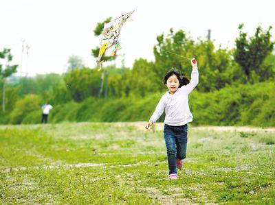 一名兒童在七里河畔放風(fēng)箏。