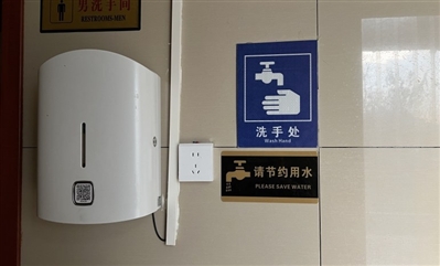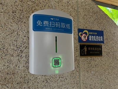 市民章小姐拿出手機(jī)掃描取紙機(jī)上的二維碼,數(shù)秒鐘機(jī)器便“吐”出長(zhǎng)長(zhǎng)的衛(wèi)生紙。洗手時(shí)將手放在洗手液盒下方,無(wú)需接觸,感應(yīng)出液。