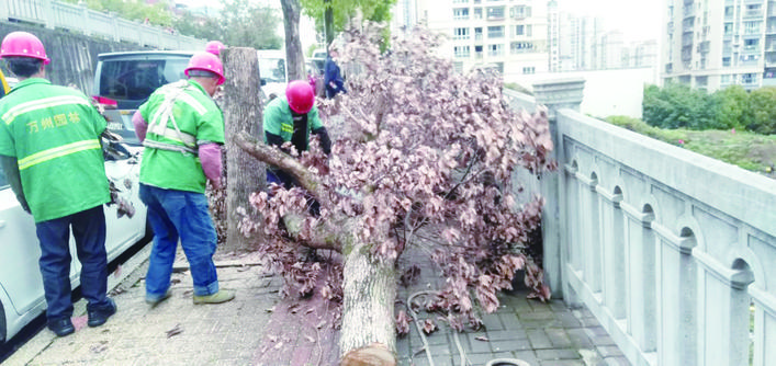 園林工人及時(shí)清理樹枝和樹葉。