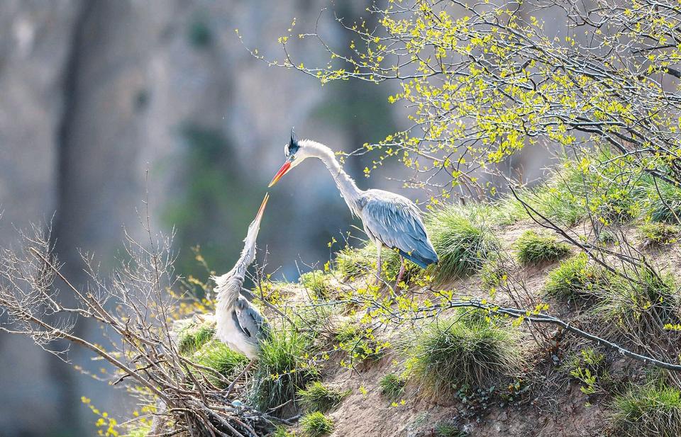 4月6日,平陸縣好漢坡黃河岸邊的懸崖峭壁上,蒼鷺在此處棲息、繁衍。近年來,運(yùn)城市圍繞黃河流域生態(tài)保護(hù)和高質(zhì)量發(fā)展,多措并舉實(shí)施水土保持工程和入黃水污染治理,極大地改善提升了當(dāng)?shù)攸S河沿線生態(tài)環(huán)境,吸引了眾多野生鳥類來此棲息繁衍,生物多樣性不斷豐富。(金玉敏)