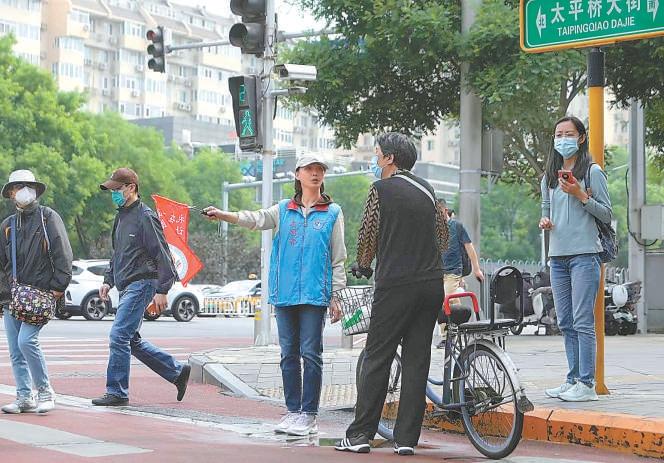 “現(xiàn)在是紅燈,請您站在白線外稍作等候?!眮碜员本┦锥紕?chuàng)業(yè)集團(tuán)有限公司和東直門街道東外大街社區(qū)的8名青年志愿者正在有序引導(dǎo)過往行人。