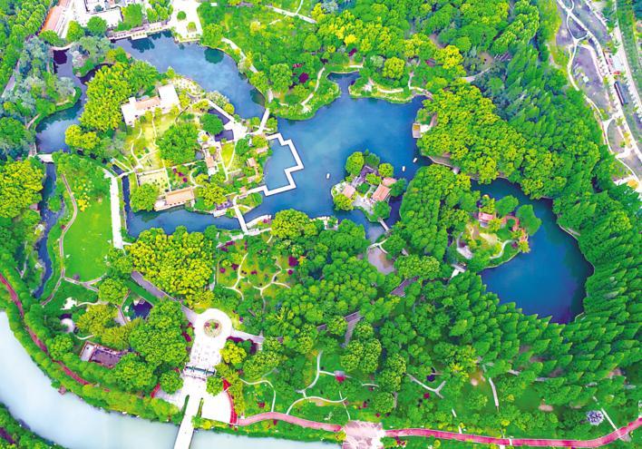 5月7日,鳥瞰武漢市青山公園,綠樹成蔭,生機(jī)勃勃。近年來,武漢市青山區(qū)加大生態(tài)文明建設(shè),昔日“灰城”展露青翠面容,近五年建成11座公園,人均公園綠地面積位居武漢前列。(記者 朱熙勇 攝)