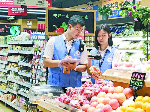 檢驗人員對商超銷售的果蔬進(jìn)行抽檢。