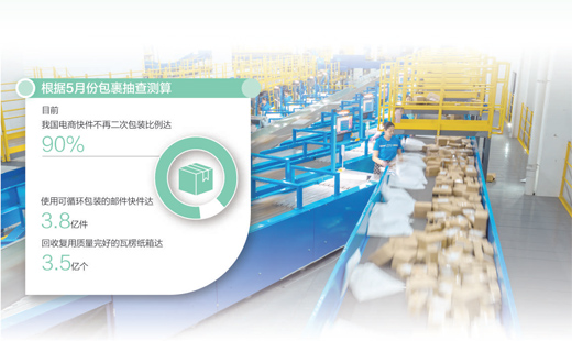 根據(jù)5月份包裹抽查測算,目前,我國電商快件不再二次包裝比例達(dá)90%,使用可循環(huán)包裝的郵件快件達(dá)3.8億件,回收復(fù)用質(zhì)量完好的瓦楞紙箱達(dá)3.5億個。