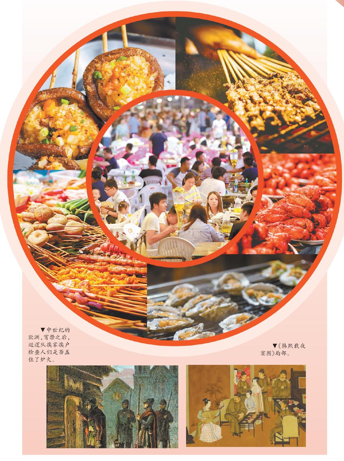 夏季的城市之夜格外熱鬧,夜市小吃攤的燈火次第點(diǎn)亮,一場屬于夜宵的狂歡也就此開始?!吧钜故程谩弊钅軗嵛棵β盗艘惶斓默F(xiàn)代人,然而回到幾百年前,夜晚的街道是禁止踏入的,甚至閉門在家也要熄滅爐火、禁止進(jìn)食。從“宵禁”到“夜宵”的那些夜晚,記錄了人們戰(zhàn)勝黑暗恐懼、點(diǎn)亮城市生活的艱辛歷程。