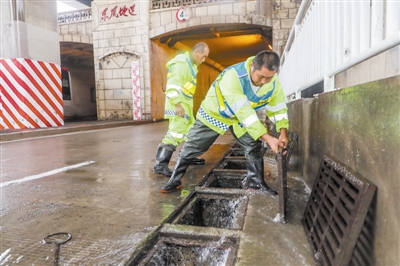為應(yīng)對(duì)強(qiáng)降雨,天津市各級(jí)排水所組織近1200名排水職工連續(xù)多日晝夜堅(jiān)守崗位,及時(shí)排查、處理暴雨可能導(dǎo)致管道堵塞、涌水峰超負(fù)荷等險(xiǎn)情。上圖 工作人員在東風(fēng)地道打井放水。記者 周偉 攝