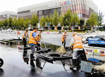 為應(yīng)對(duì)此次強(qiáng)降雨,天津市環(huán)衛(wèi)部門16000名環(huán)衛(wèi)工人奮戰(zhàn)在第一線,753部作業(yè)車輛全部在崗,及時(shí)對(duì)城市環(huán)境進(jìn)行清整作業(yè),保障市民安全出行。圖為河西區(qū)環(huán)衛(wèi)工在樂(lè)園道等區(qū)域排水。 記者 龐劍 攝