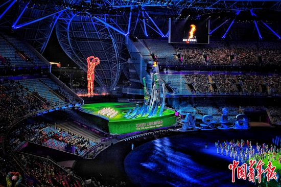 10月8日,浙江杭州市奧體中心體育場(chǎng),杭州第19屆亞運(yùn)會(huì)閉幕式舉行,“數(shù)字火炬手”擺出“比心”的姿勢(shì),見證杭州亞運(yùn)會(huì)主火炬緩緩熄滅。中青報(bào)·中青網(wǎng)記者 趙迪/攝