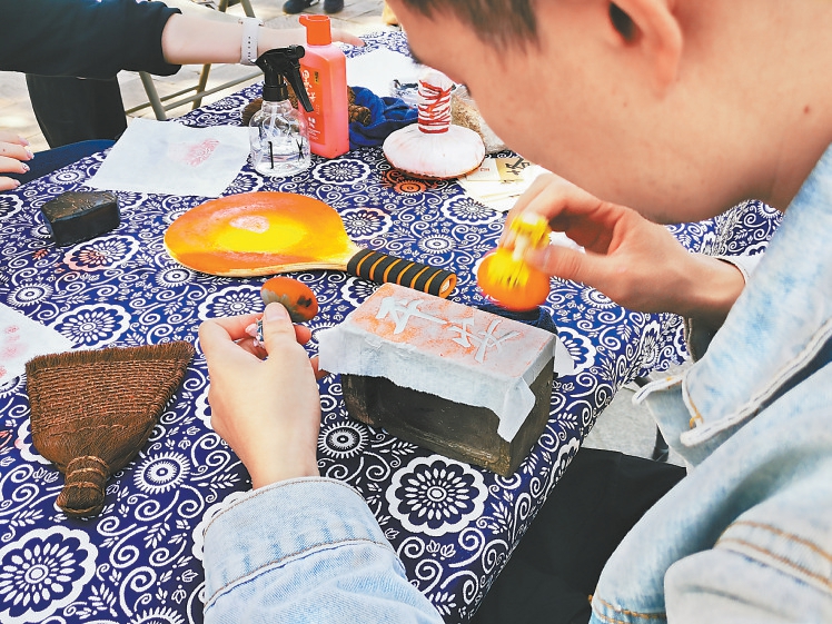 國慶期間,游客在八大處公園舉辦的活動(dòng)中體驗(yàn)非遺傳承技藝拓印。記者 吳鏑 攝