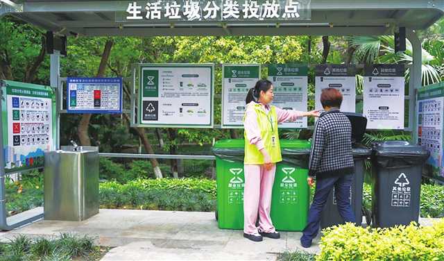 垃圾分類工作人員開展分類指導(dǎo)工作,引導(dǎo)居民正確投放