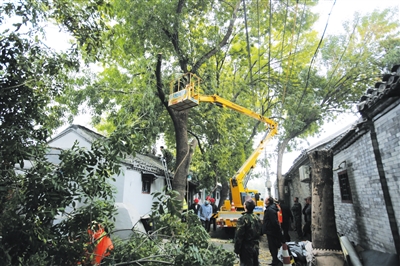 9點(diǎn),斷接導(dǎo)線工作結(jié)束,胡同的高壓線纜“脫網(wǎng)”。緊接著,橘黃色的高架車開(kāi)進(jìn)胡同,將拿著油鋸的工人送上十幾米的高空,他們要對(duì)高壓線附近的樹(shù)冠進(jìn)行修剪。