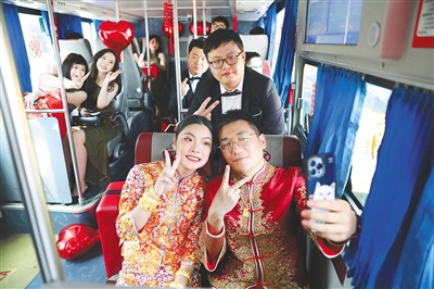 “結(jié)婚當(dāng)天,大家需要張羅的事很多,需要早起,會擔(dān)心司機疲勞駕駛,大巴車剛好就解決了這個煩惱?!比ツ?2月28日結(jié)婚的李媛媛也選擇了大巴車迎親。她說,現(xiàn)在年輕人結(jié)婚,追求婚禮簡約、熱鬧,大巴車安全又環(huán)保就成為他們迎親車輛選擇的重要考慮之一。看到也有很多新人選用大巴車迎親,她和丈夫胡先生也有了嘗試的想法。誰料想,這個提議得到雙方父母的贊同。“家里的親戚都很贊同,大家可以坐在大巴車內(nèi)互動交流,氛圍非常好?!崩铈骆抡f,與傳統(tǒng)迎親車隊相比,租用大巴車更加經(jīng)濟實惠。